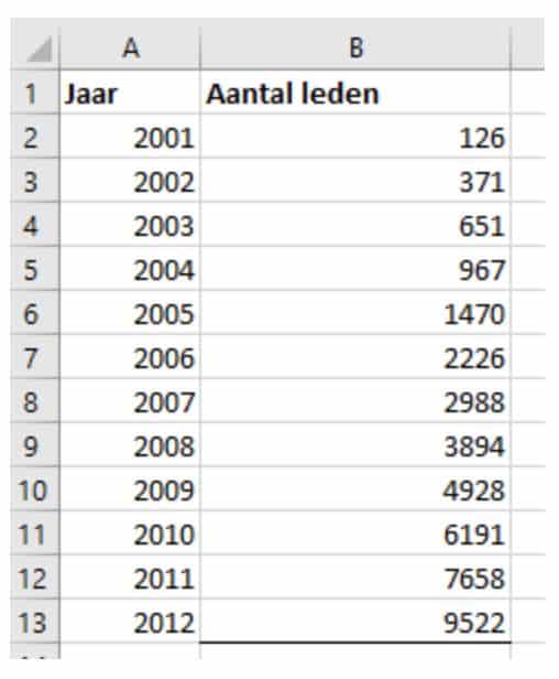 Je kunt ook zelf formules toevoegen. Dit doe je door in de cel = te typen, gevolgd door de berekening die je wil doen. In het voorbeeld willen we weten wat het totaal aantal leden is in een bepaald jaar. Dit doen we door het totaal aantal leden van het vorige jaar op te tellen bij het aantal nieuwe leden in dit jaar. Dit kunnen we doen door de namen van de cellen (de rij en de kolom) in te typen. Als je op enter drukt, doet Excel de berekening voor je.